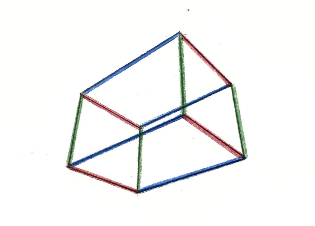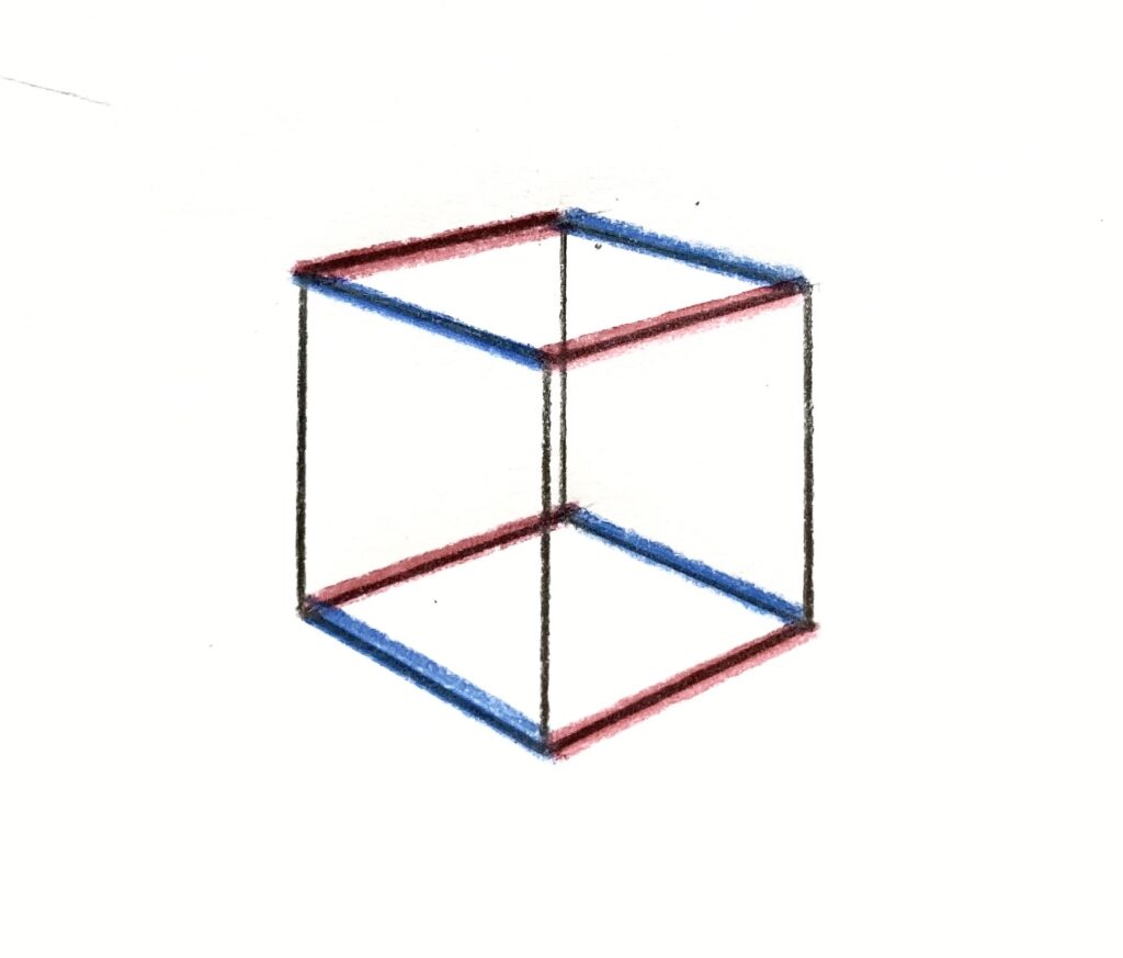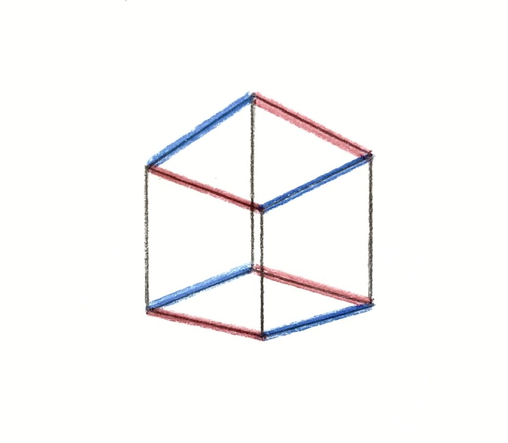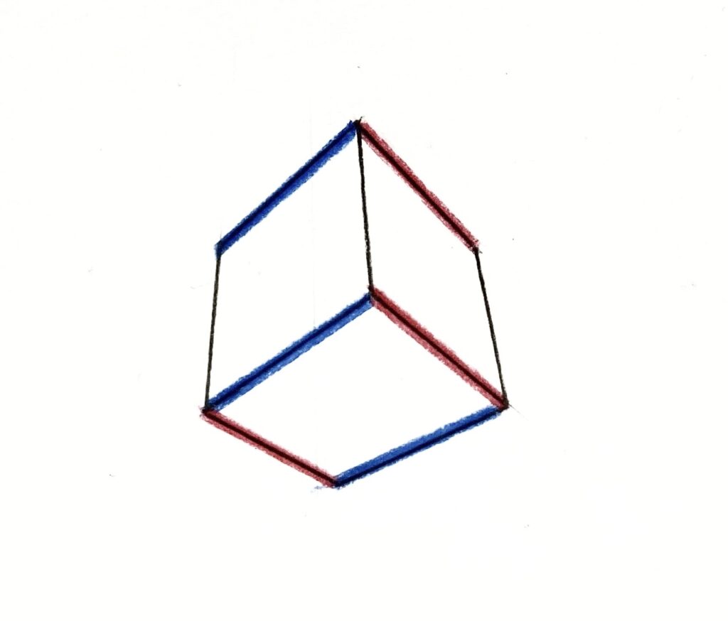 青の辺は左の消失点へ、赤の辺は右の消失点へ向かっているよ