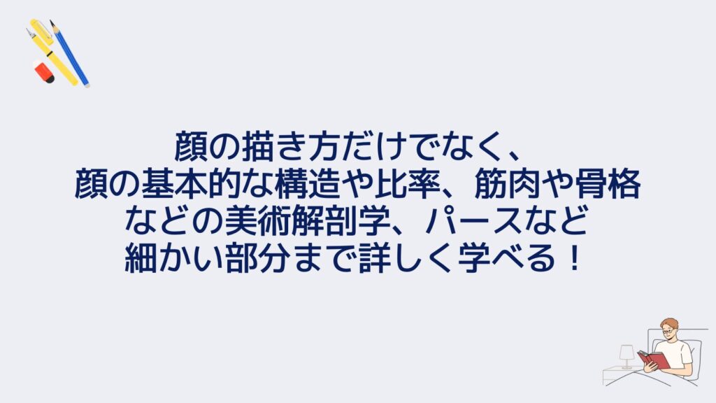 顔の描き方だけでなく、顔の基本的な構造や比率、筋肉や骨格などの美術解剖学、パース、そして年齢や性別の違いによる顔の特徴といった細かい部分まで詳しく学びたいな