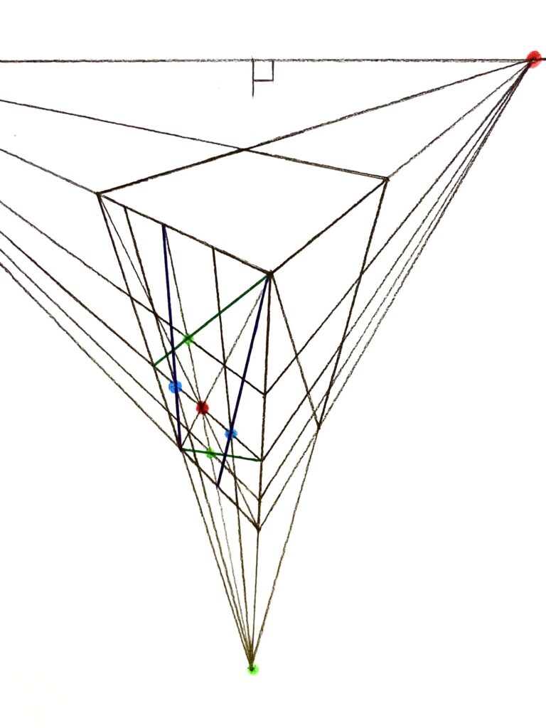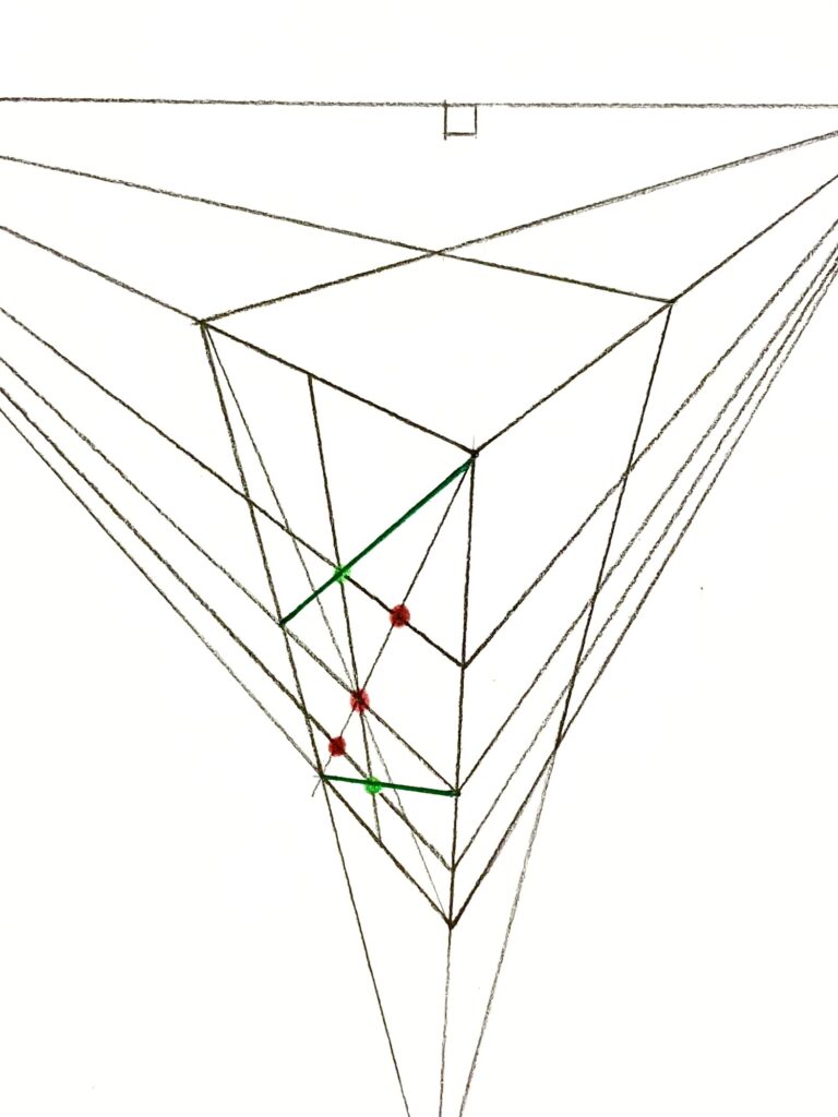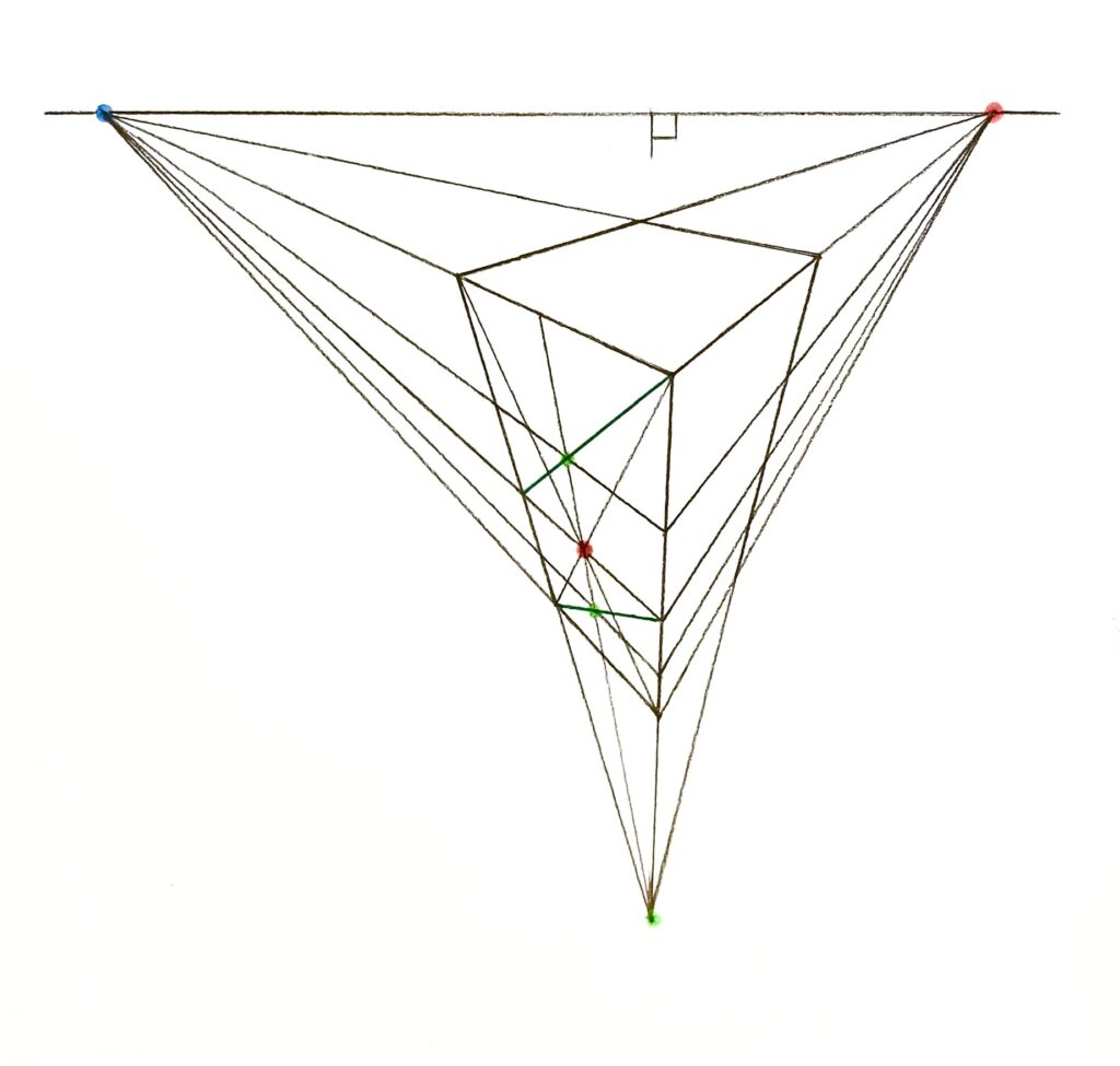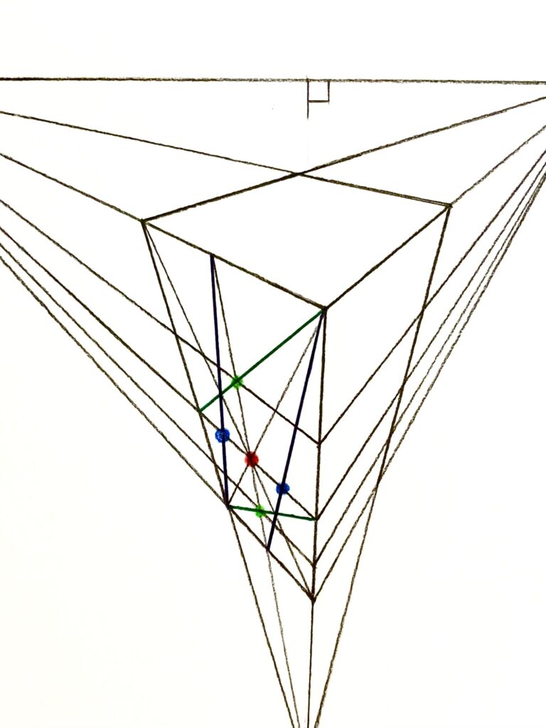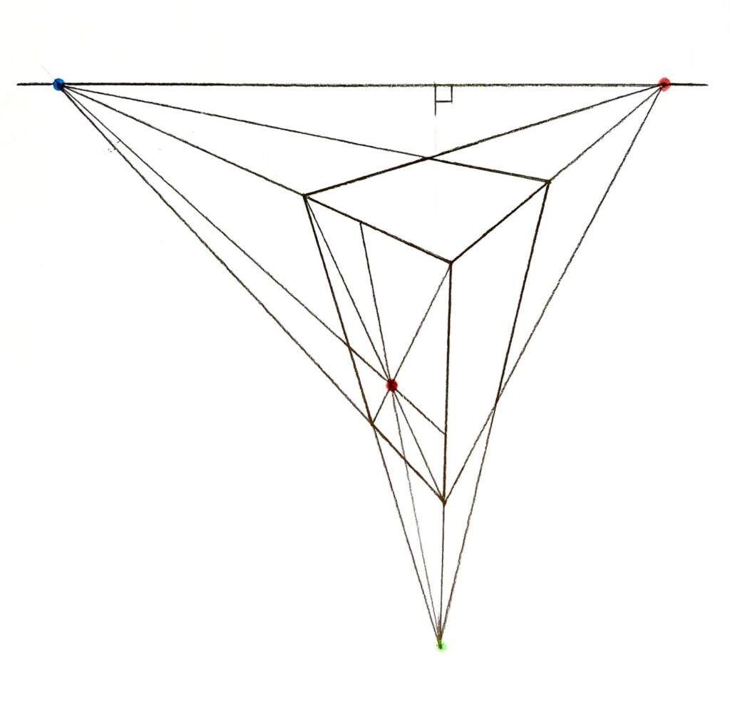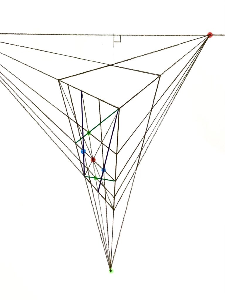 このとき、縦線は3つ目の縦方向の消失点を使って、横線はアイレベル上の右側の消失点を使って引きます。