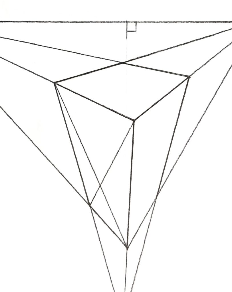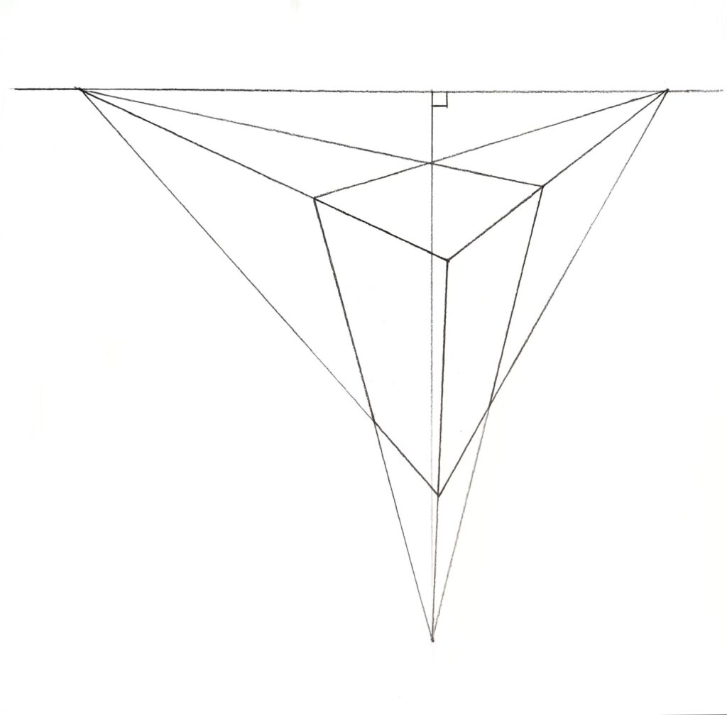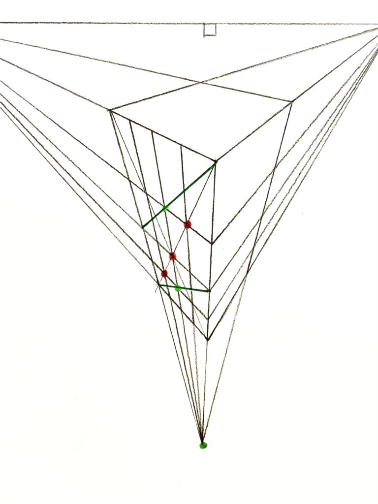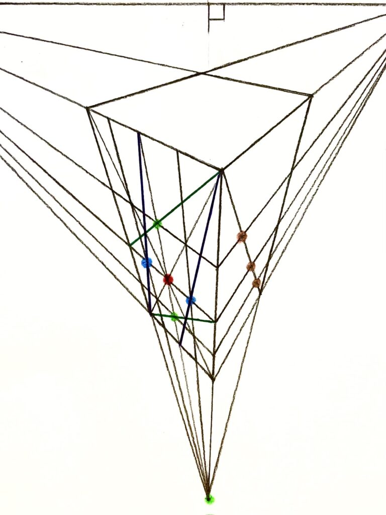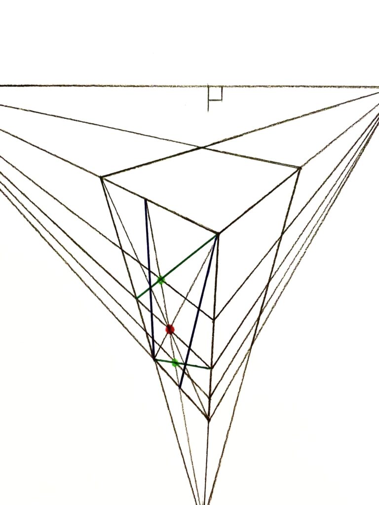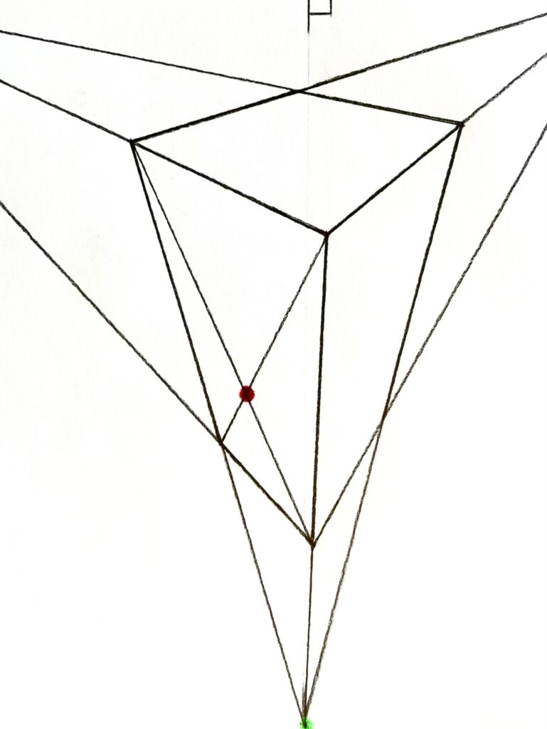 このとき、縦線は3つ目の縦方向の消失点を使って、横線はアイレベル上の右側の消失点を使って引きます。