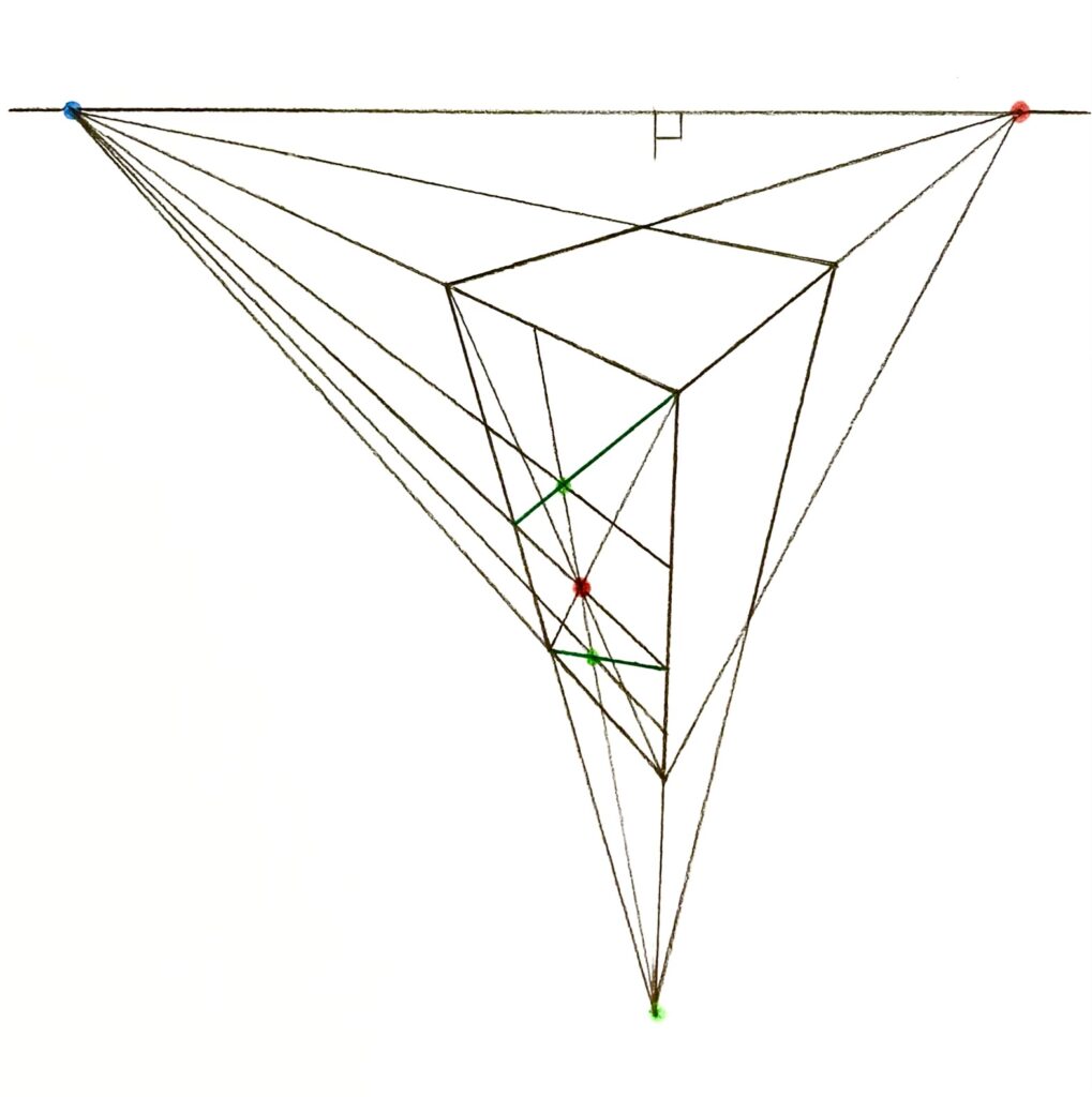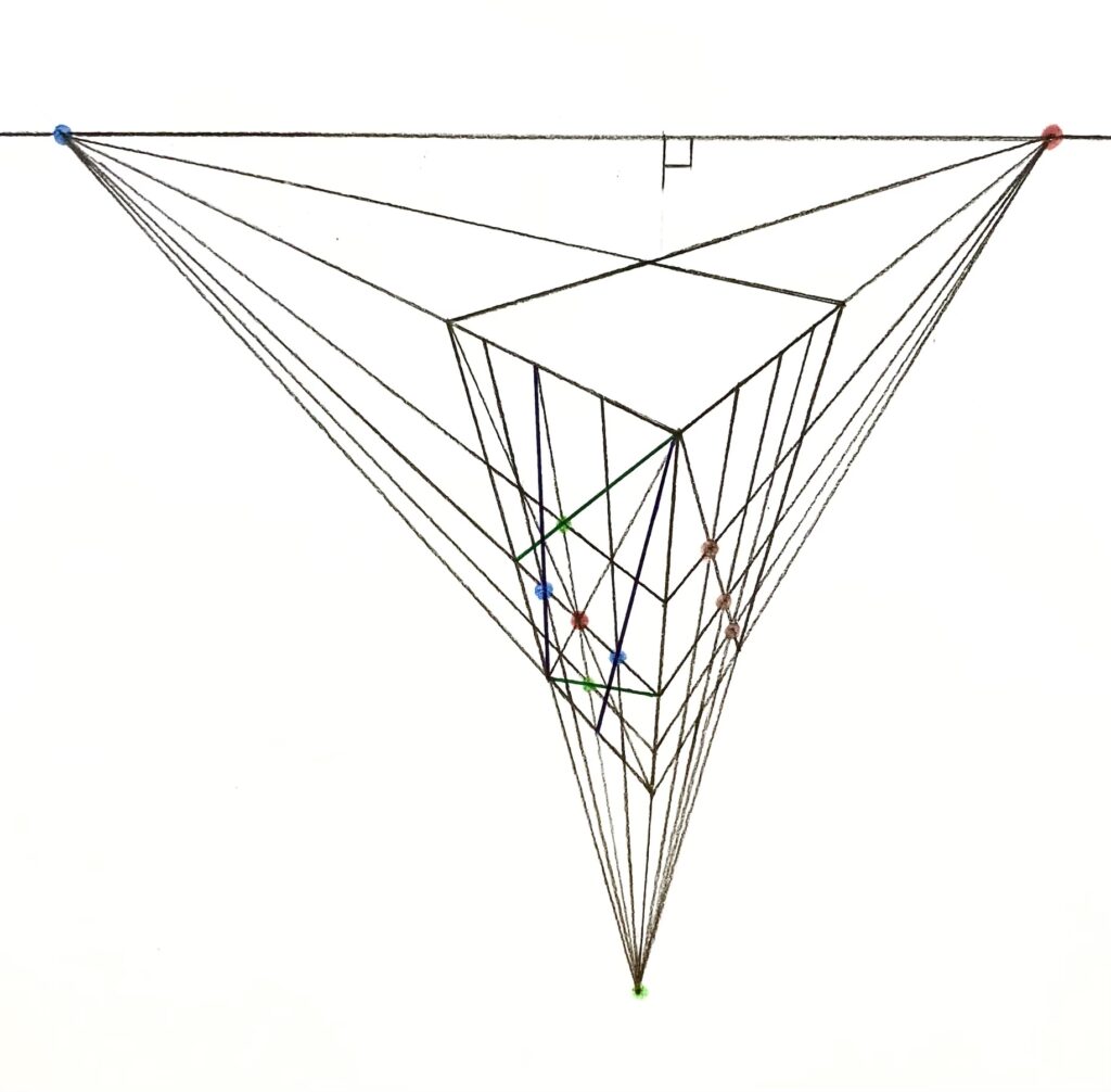 このとき、縦線は3つ目の縦方向の消失点を使って、横線はアイレベル上の左側の消失点を使って引きます。