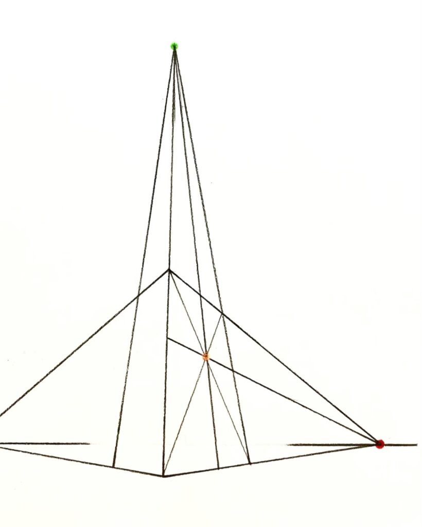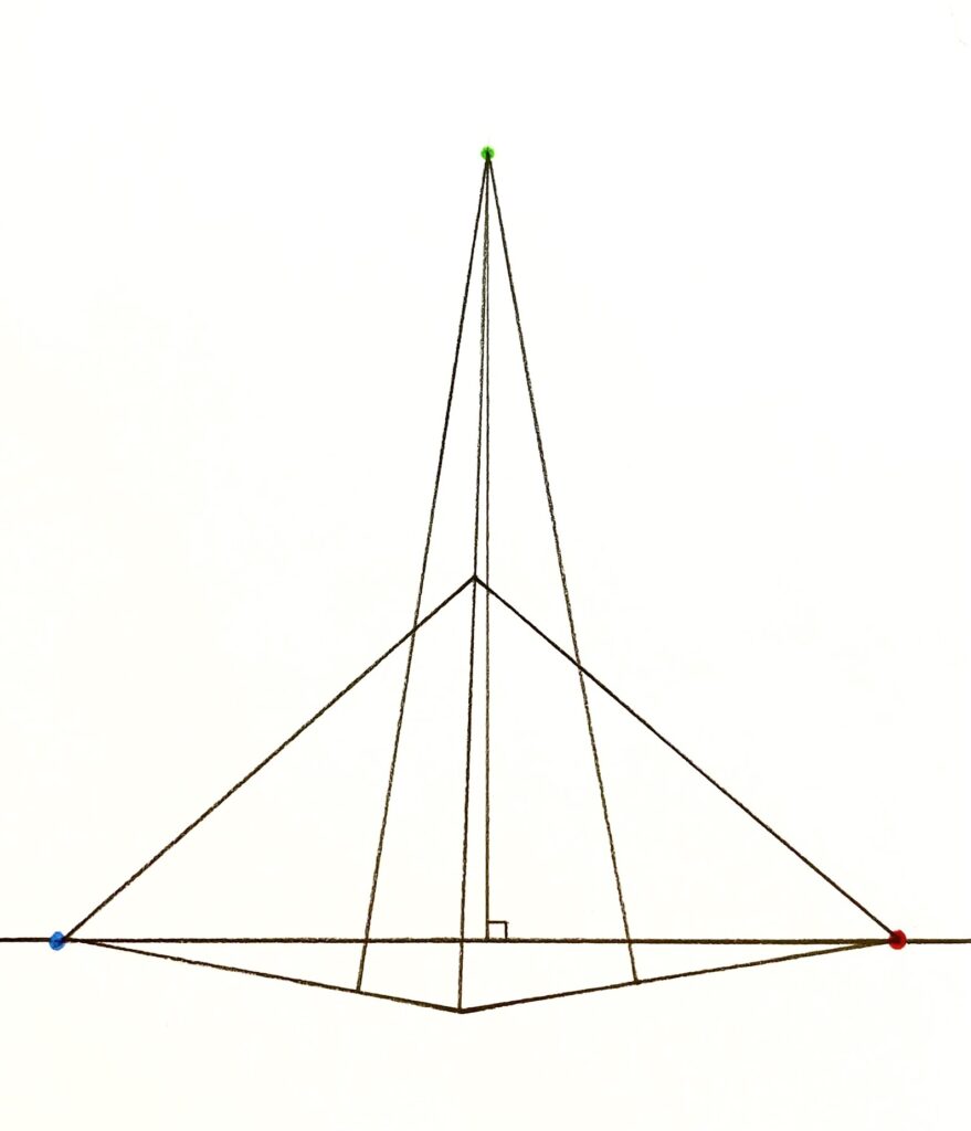 見上げる構図なので、3つ目の縦方向の消失点は、アイレベルより上に設置するよ
