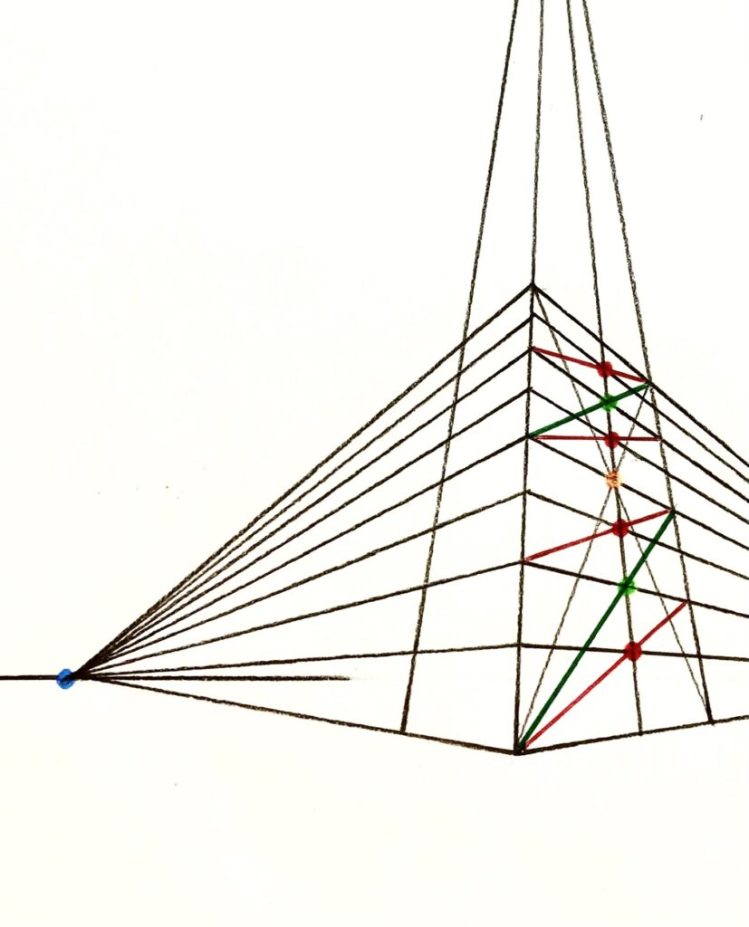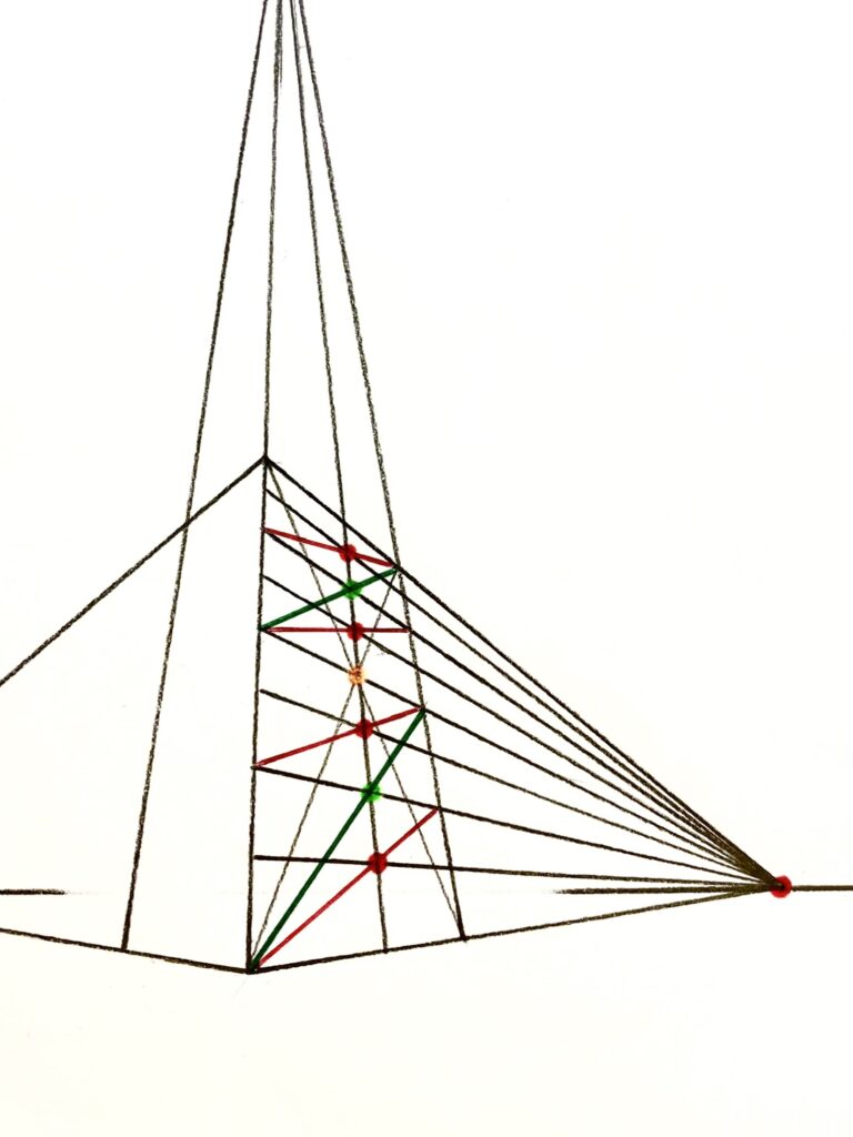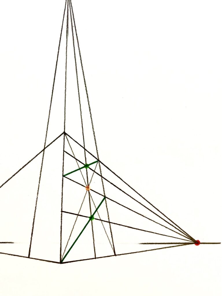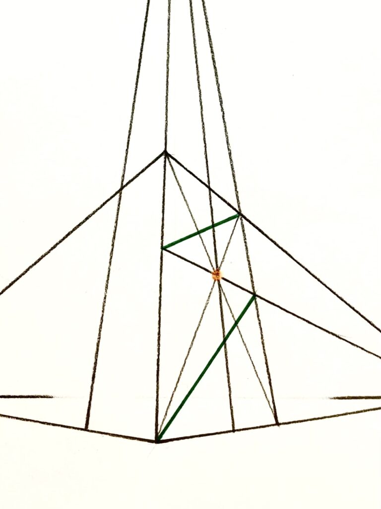 今はわかりやすいように濃く引いているけど、対角線は絵の一部ではないから、なるべく薄く引こう!