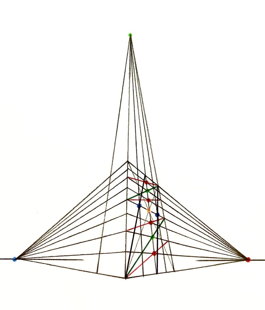 縦線は左右の縦辺2本に平行だから、3つ目の縦方向の消失点へ。