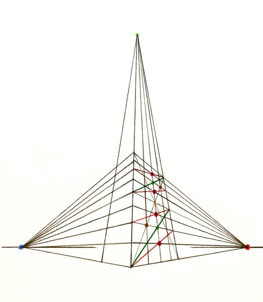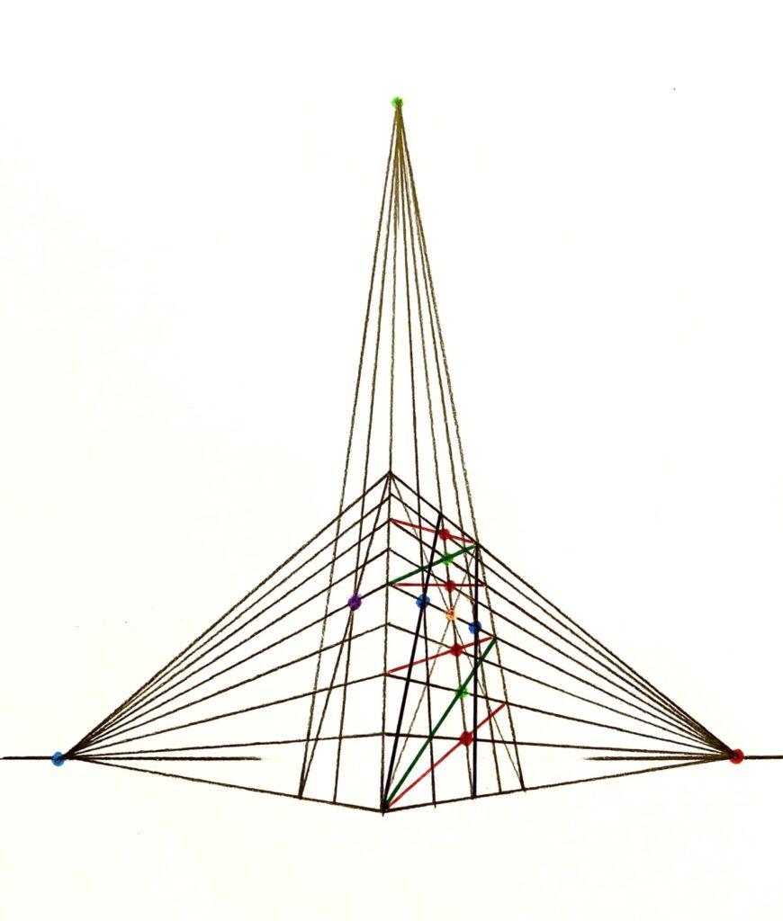 一点透視図法や二点透視図法と違って定規で測って分割することはできません。