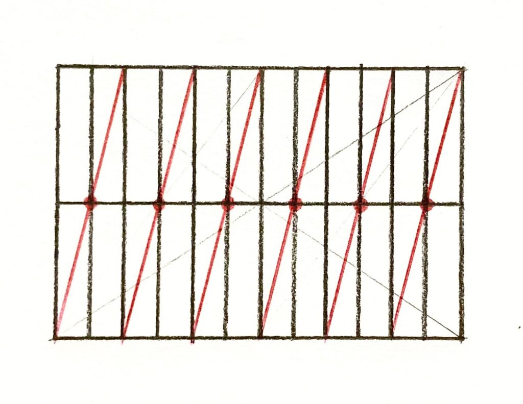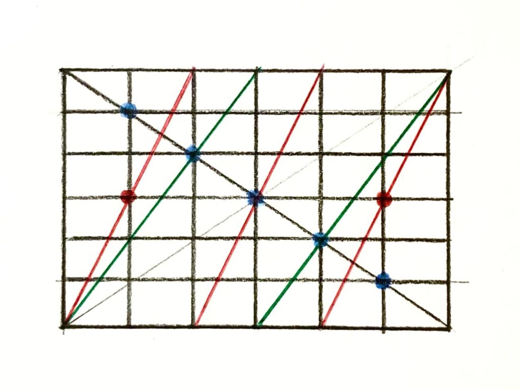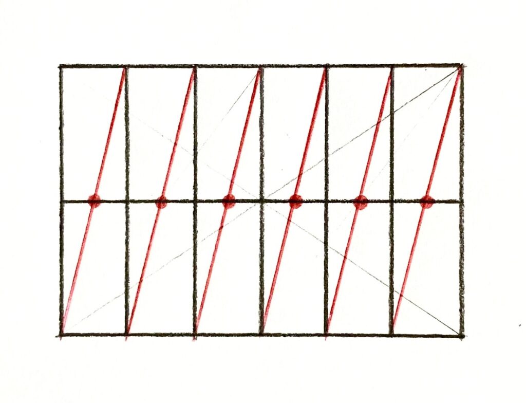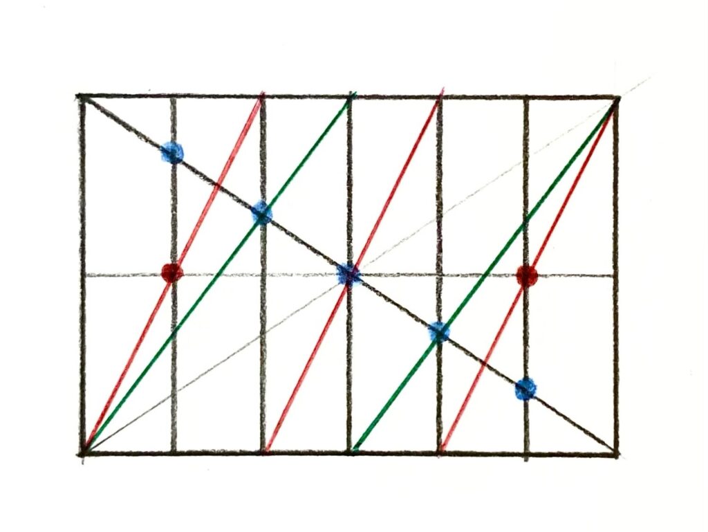 以下のように、一番大きい長方形に引いた対角線と、6等分している縦線との交点(青の点)が5個ありますよね。