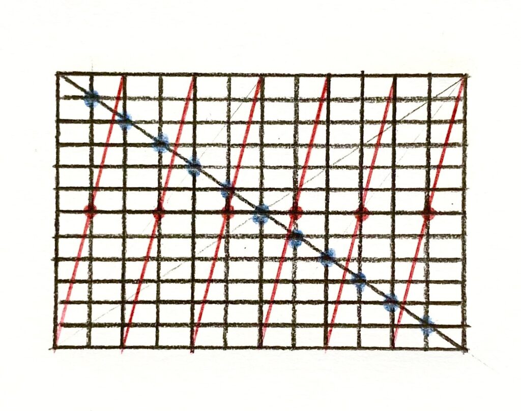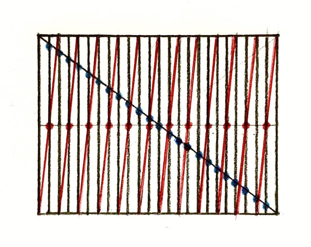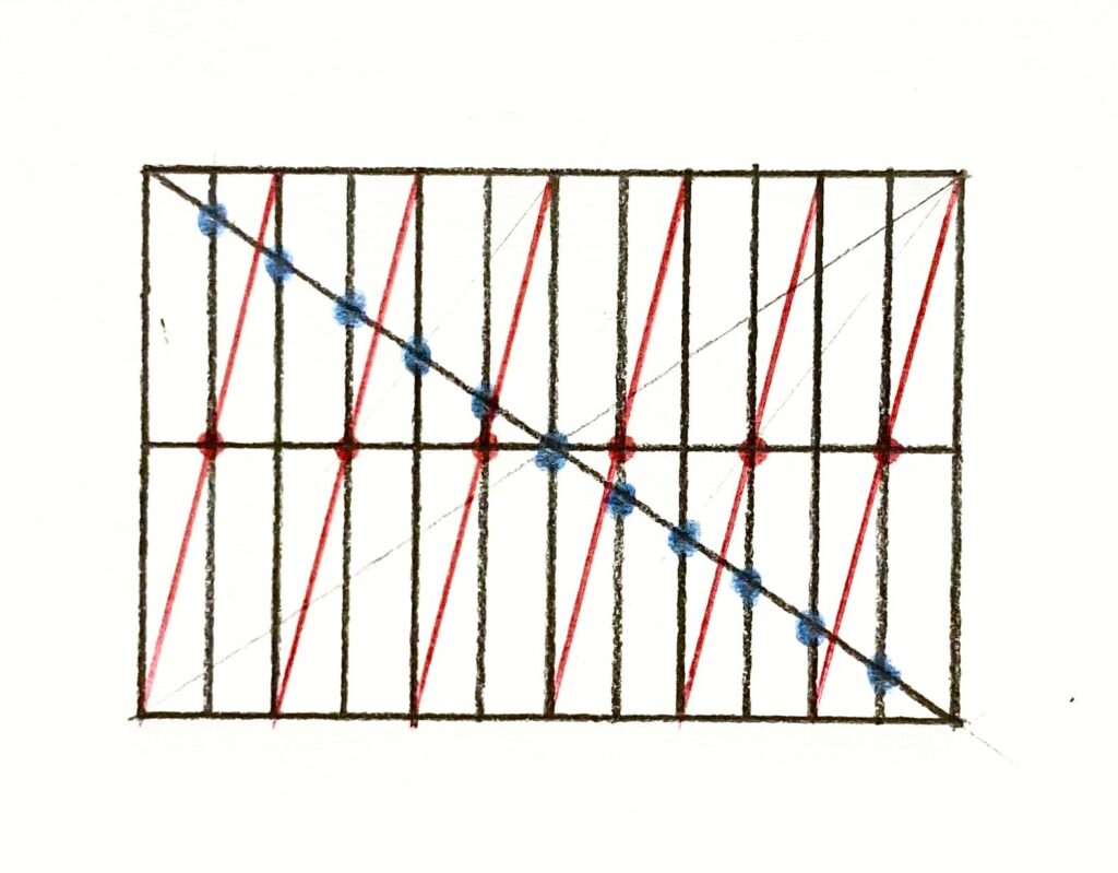 以下のように、一番大きい長方形に引いた対角線と、12等分している縦線との交点(青の点)が11個ありますよね。