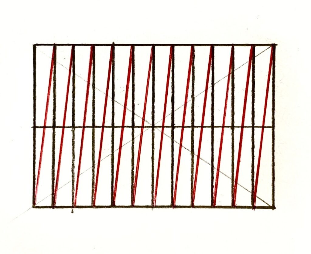 まず、12等分してできた、それぞれの四角形に対角線(赤の線)を1本ずつ引きます。