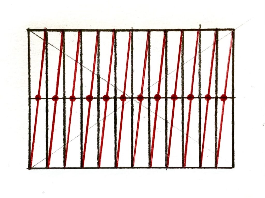 詳しくは、パース(透視図法)で6分割、6等分する方法をわかりやすく解説にて解説しています。