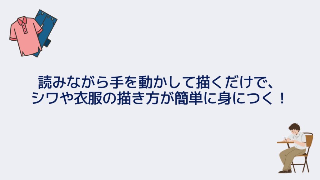そして、シワや衣服の描き方を、とてもわかりやすく見やすい手描きのイラストを使い、